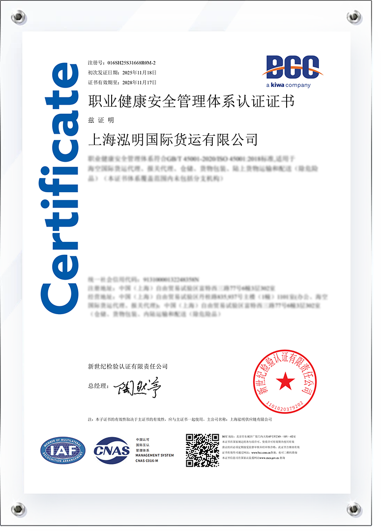 近日,经过权威机构的严格审核与评估,泓明集团旗下上海泓明供应链有限公司、上海泓明国际货运有限公司与上海泓明医疗供应链服务有限公司同步通过ISO45001:2018职业健康安全管理体系国际认证,成为行业中在职业健康安全管理领域率先全面接轨国际标准的标杆企业之一。
